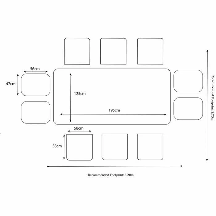 - Table: W195cm (6ft 4in) x D125cm (4ft 1in) x H76cm (2ft 10in)