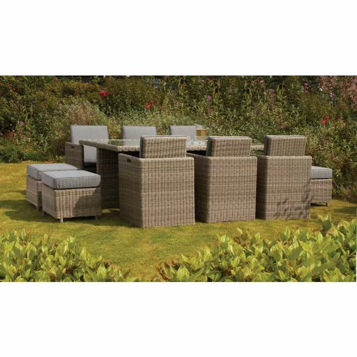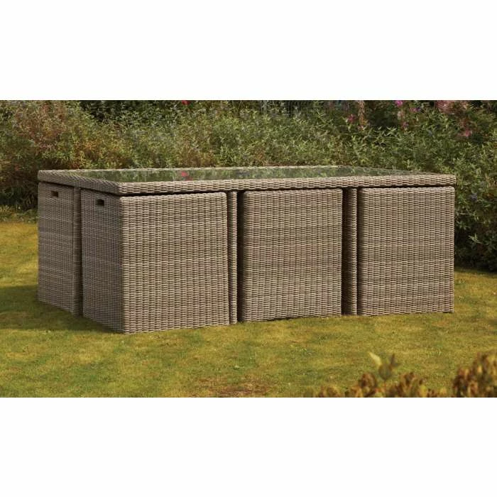 The Wentworth 10 seater cube set is a symphony of timeless design and practical space saving storage. Retaining classic style with its aluminium framework construction and hand woven synthetic half round weave rattan it offers style, comfort, strength and durability. Complete with a 195 x 125cm cube table with parasol hole, 6 cube chairs with folding backrests and 4 footstool that store away compactly inside the chair its cubic design allows it all to store away compactly ensuring minimal maintenance, it is perfect for use all year round and will provide years of enjoyment.