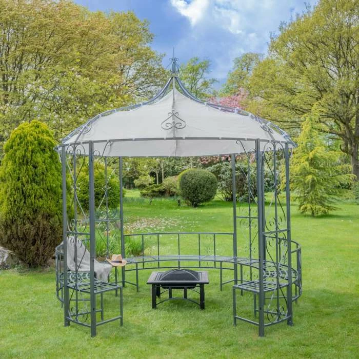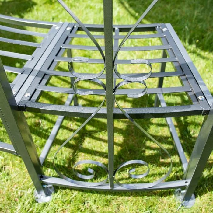 Create a romantic hideaway in your garden with this traditional metal gazebo, complete with an integrated bench for ultimate garden relaxation. This luxurious gazebo features delicate filigree detailing on the supporting side walls and roof and is finished with a stylish ornate finial for that final touch of grandeur. This beautiful addition to your garden provides fantastic shelter from both UV rays and sudden showers thanks to the 180gsm polyester roof so is as practical as it is stylish.