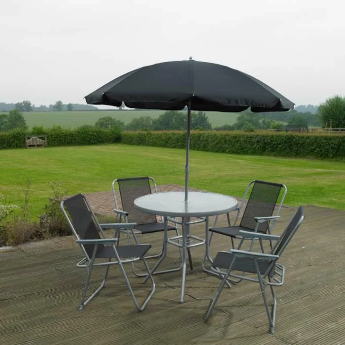 This stylish garden furniture set is a splendid way to spend the day relaxing in your back garden whilst providing your home with a touch of elegance. It includes a set of 4 chairs and an attractive glass table on which you can place your drink, meal, or book. The set comes complete with a sturdy parasol that will help shade you from the sun, providing you with a set that is just as practical as it is pleasing to the eye.
