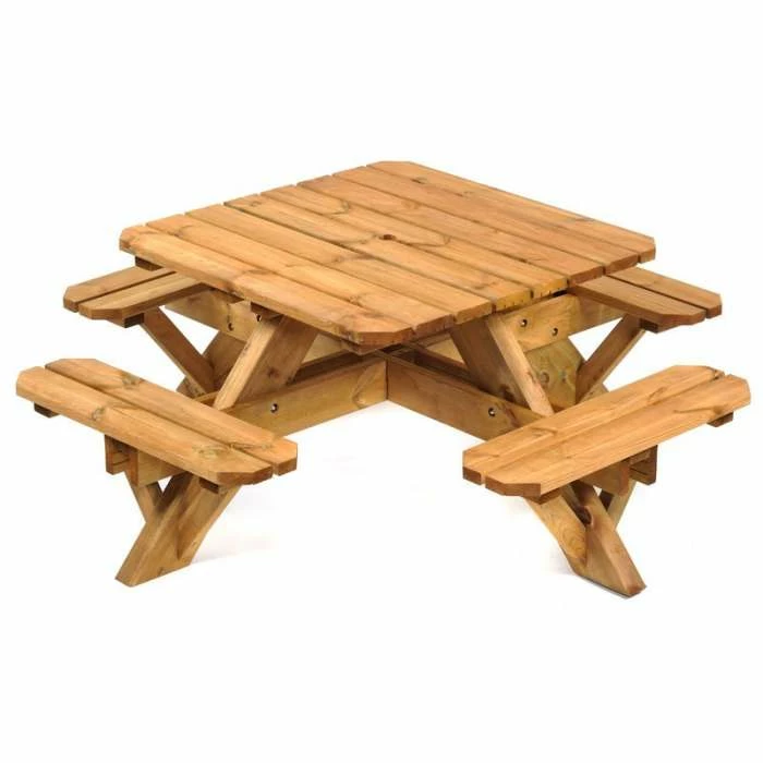 A quality picnic table precision made from Slow Growing Pine, with rounded edges, and pressure treated with Tanalith E. Delivered flat packed for easy self assembly. 42 mm timbers.