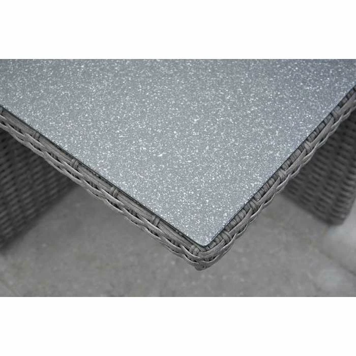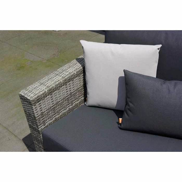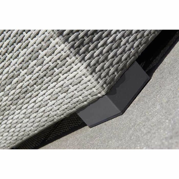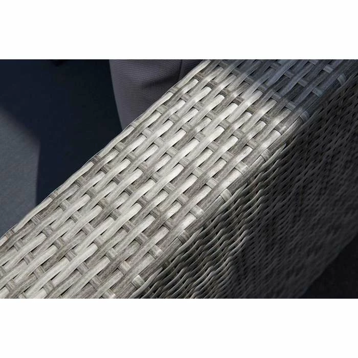 The range is presented in our popular Yacht Grey weave and Carbon cushions. The Aya Square Corner set includes a square corner piece, bench left and right, lounge chair and rectangular height adjustable table with Spraystone top.