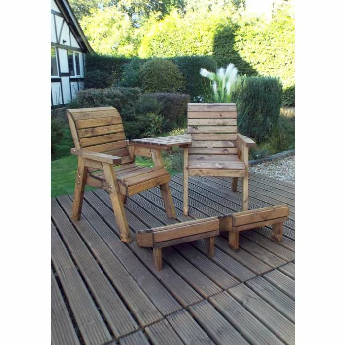 This delightful deluxe lounger set is perfectly designed for relaxation in the garden. These seats come with their own footstools for increased leisure. The set also features an angled table tray that is designed to fit over the arms of the chairs, connecting them and making an ideal surface for drinks, snacks, and your favourite book. Made from Scandinavian redwood, the set is coated in an oil based preservative to keep it protected from the elements. It’s also constructed with galvanised zinc bolts that are rustproof, and provide excellent rigidity, ensuring that your lounger will last. Handmade in the Staffordshire Moorlands from sustainably sourced timber, this deluxe lounger set has been created by expert craftsmen using traditional woodworking techniques. With its classic design and rustic appeal, this furniture is perfect for any garden or patio. Kick back, relax, and enjoy your outdoor space.
