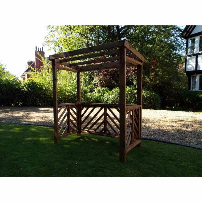 This BBQ shelter is a beautifully made structure that creates a distinguished setting for your BBQ while sheltering it from changeable British weather. Constructed from sustainably sourced timber and handcrafted in the Staffordshire Moorlands by skilled craftsmen using traditional methods, this product showcases high-quality British manufacturing at its best. It is also built to last – galvanised zinc bolts have been used for rustproof rigidity and the wood has been treated with an oil-based preservative to help resist the elements. The BBQ shelter features trellis style sides to aid weather protection and create a pleasing aesthetic. Added protection can be added to the slatted roof with a removable cover finished in an eye-catching burgundy intended to complement the natural colouring of the timber.