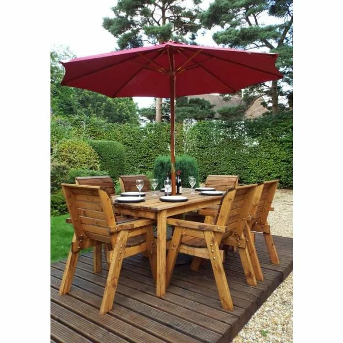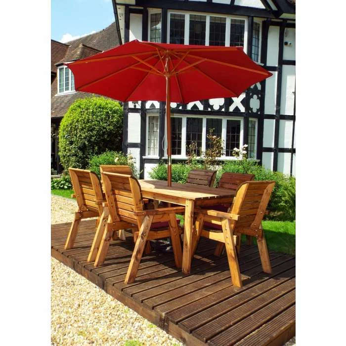 Charles Taylor Wooden Garden 6 Seater Rectangle Table Dining Set with Burgundy Cushions and Parasol