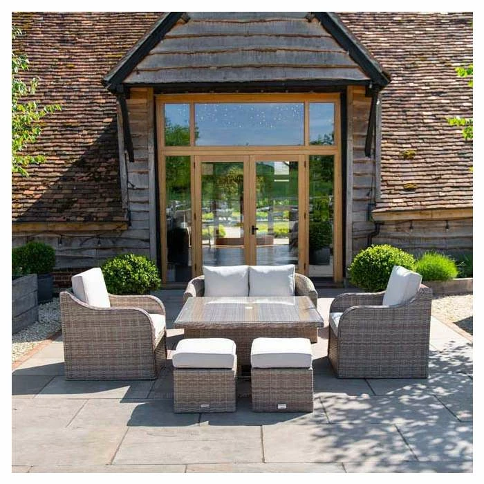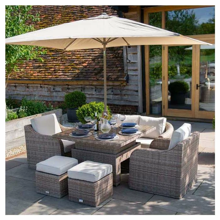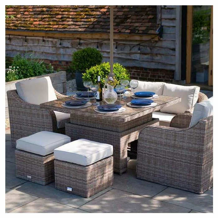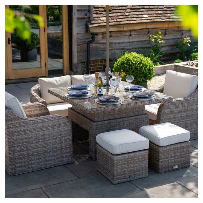 Built for convenience, every piece of this set can be adjusted to be used your way, with an easy-to-use rising table and the footstools double as extra seating when you need. The perfect way to turn your outdoor areas into multifunctional spaces.