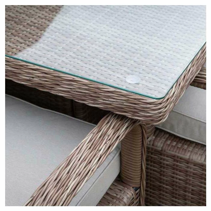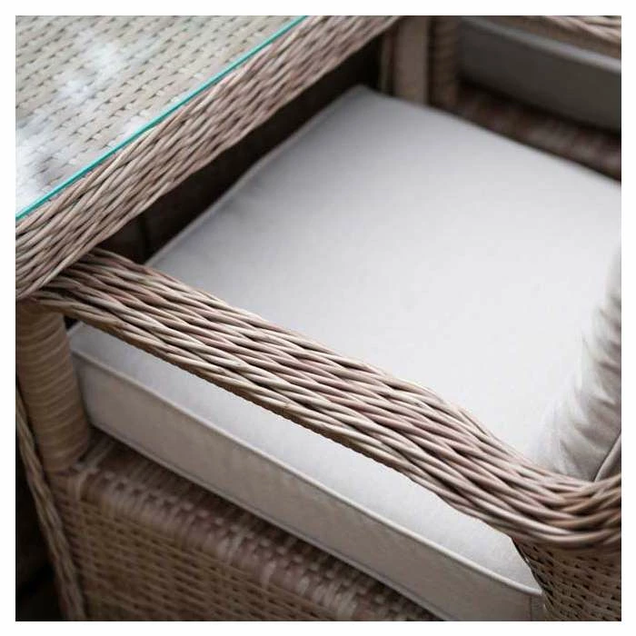 Versatile and multifunctional, transform your outdoor areas into modern living spaces with this classic dining set. The deep seated chairs feature wide armrests and curved backs which are ergonomically designed, paired with the thick and comfy cushions, so you can truly relax into uncompromising outdoor comfort and support. This premium dining set lets you entertain or relax outside morning, noon and night and in any season, giving you the best year-round outdoor living set-up.