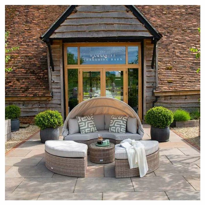 In either layout, the thick, foam-filled cushions give you unrivalled comfort and support. Remove the cushion of the round footstool to turn it into a handy table. The main sofa section comes with a retractable canopy that offers protection in all weathers – giving you the ability to enjoy a multi-use outdoor space year-round.