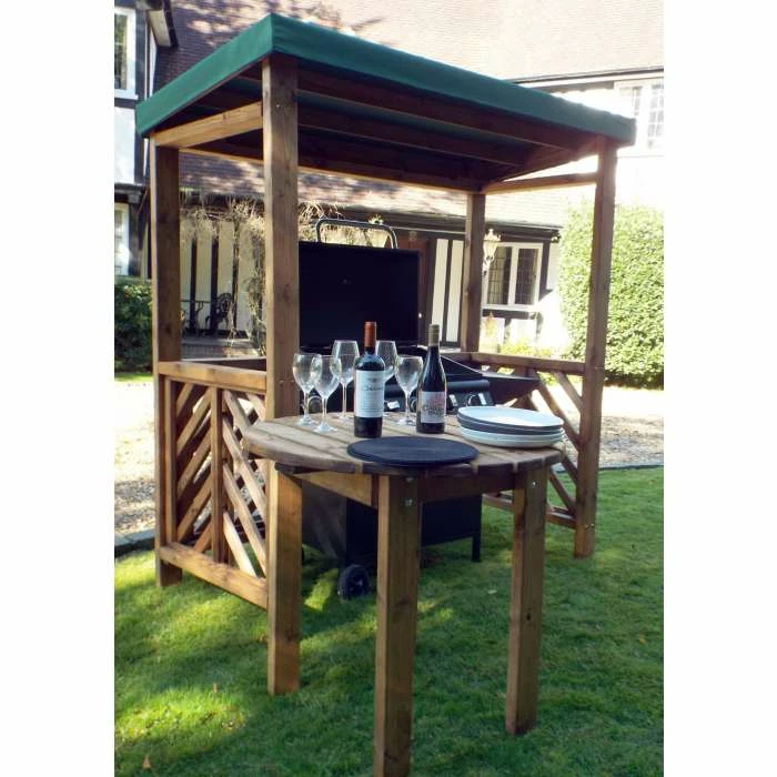This BBQ shelter is a beautifully made structure that creates a distinguished setting for your BBQ while sheltering it from changeable British weather. Constructed from sustainably sourced timber and handcrafted in the Staffordshire Moorlands by skilled craftsmen using traditional methods, this product showcases high-quality British manufacturing at its best. It is also built to last – galvanised zinc bolts have been used for rustproof rigidity and the wood has been treated with an oil-based preservative to help resist the elements. The BBQ shelter features trellis style sides to aid weather protection and create a pleasing aesthetic. Added protection can be added to the slatted roof with a removable cover, finished in a beautiful forest green intended to complement the natural colouring of the timber.