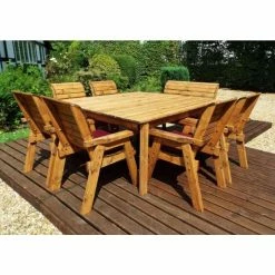 Charles Taylor Wooden Garden 8 Seater Rectangle Table Dining Set with Burgundy Cushions and Parasol
