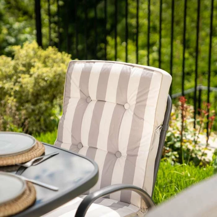 The gorgeous reversible cushions are thick, luxurious and highly versatile. Made from extremely durable powder coated steel this dining set has excellent resistance to adverse weather conditions and is easy to put together.