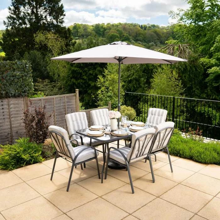 This brilliant six seater garden dining set is perfect for enjoying a big family lunch in the sunshine. With a fantastic high-quality parasol that comes with its own crank, you can enjoy spending time in your garden without having to worry about the harsh heat.