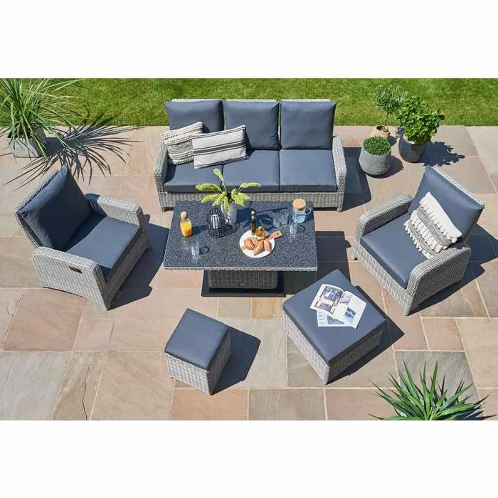 The table features our innovative spraystone glass top, crushed pieces of stone sprayed onto a glass plate giving you a very strong and natural look, with the flexibility in height adjustment. The set is complimented with the Carbon soft touch ALL WEATHER cushions