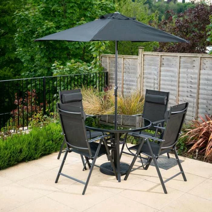 This brilliant four seater garden dining set is perfect for enjoying a big family lunch in the sunshine. With a fantastic high quality parasol that comes with its own crank you can enjoy spending time in your garden without having to worry about the harsh heat.