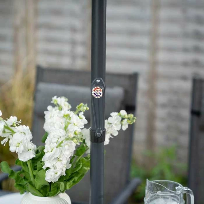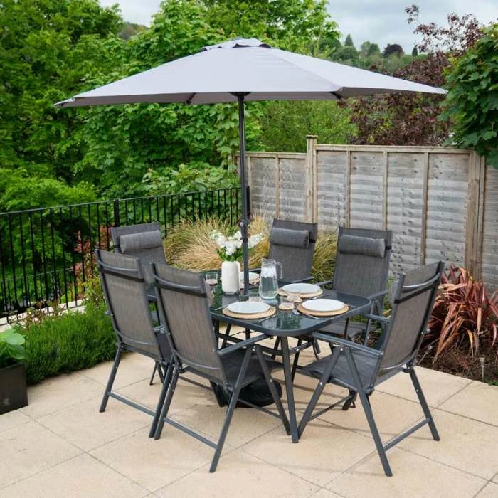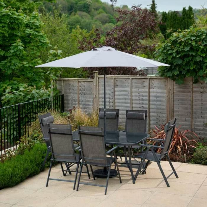 This brilliant six seater garden dining set is perfect for enjoying a big family lunch in the sunshine. With a fantastic high quality parasol that comes with its own crank you can enjoy spending time in your garden without having to worry about the harsh heat. The adjustable chairs are made with durable SuperPolyTex fabric which is not only extremely comfortable but also easy to clean. The powder coated steel frame has excellent resistance to adverse weather conditions and is also easy to put together.