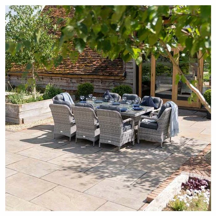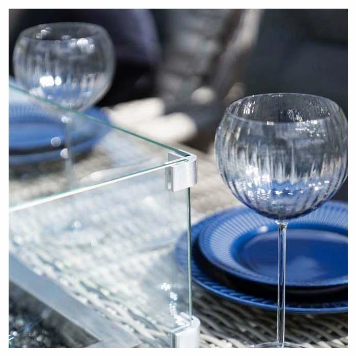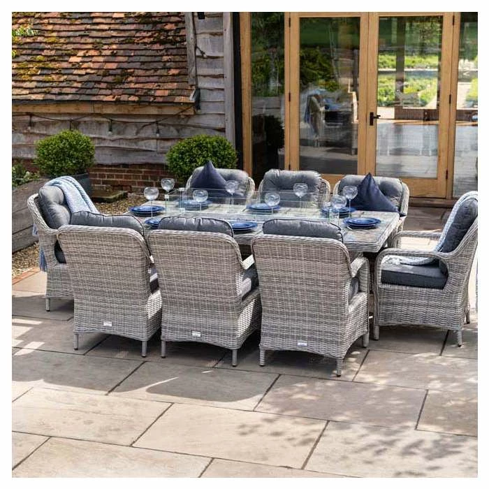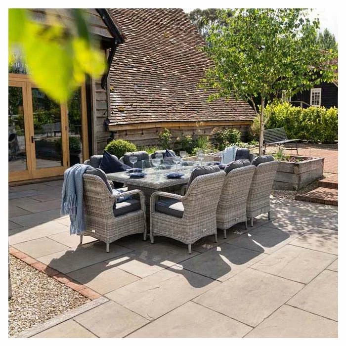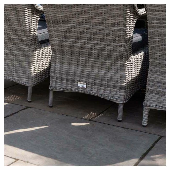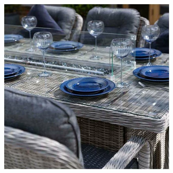 Luxury Rattan 8 Seater Rectangular Fire Pit Garden Dining Set in Pebble by Primrose Living