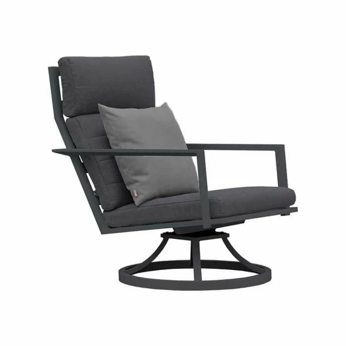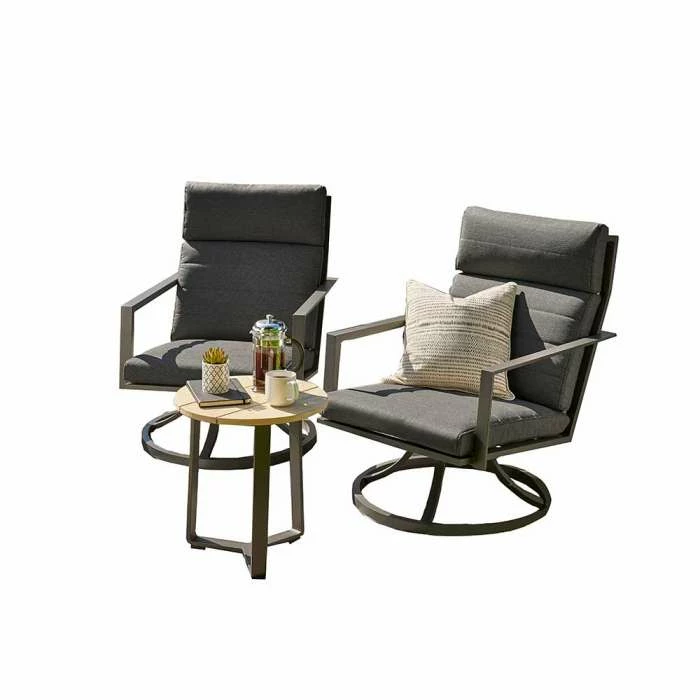 The inspiringly stylish Maroon Swivel Chair is a comfortable lounge – swivel chair with our ALL WEATHER soft touch cushions, you can relax on it for hours. The seat of the chair also slopes backwards for an ultimate seating angle. With its full 360-degree rotation, you can easily turn with the sun! In addition, the chair looks beautiful, with its aluminium frame and round base, it contrasts nicely with the straight angles of the armrests. And is complimented in style with our handy Blixum Coffee Table. The set consists of 2 Swivel Chairs and a small Coffee Table.