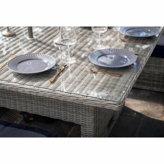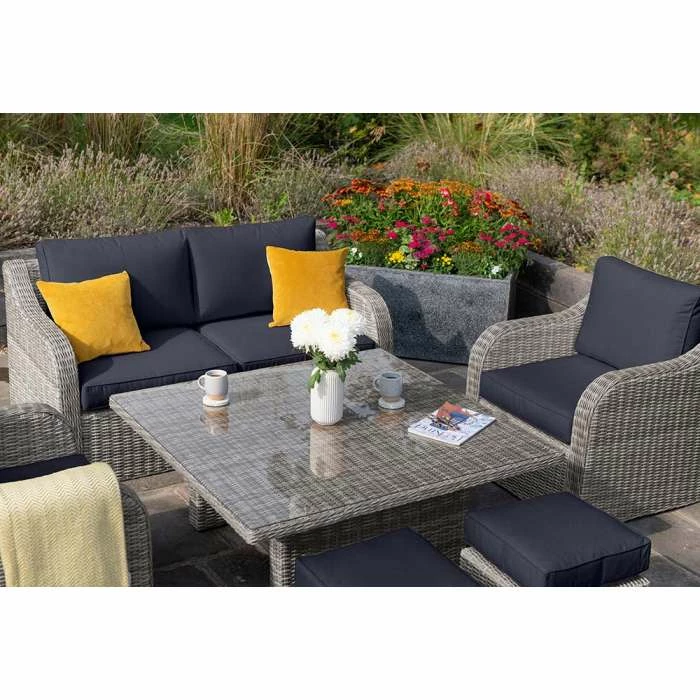Dine and entertain in comfort and style. Designed for modern outdoor living, this set can be arranged any way you want, and it’s built to last using a premium double-woven half weave rattan around a powder-coated aluminium frame.