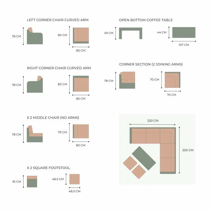 Need a different set up? Versatility is at the heart of this set’s design: the sofa pieces can uncouple and clip back together in any arrangement whilst the foot stools can become extra seating when you have unexpected guests. When not needed, the footstools can be stored out of the way under the safety glass topped table.