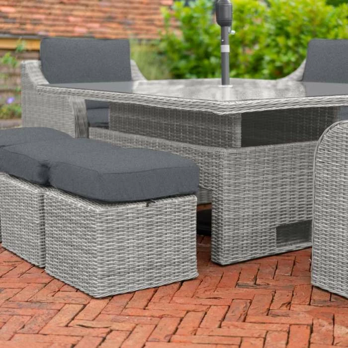 Designed for convenience, each piece of this set can be adjusted to be used your way. The footstools double as extra seating when you need it, and to go from casual entertaining to dining then just change the height of the adjustable table in moments.