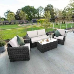 Designed for modern outdoor living, this is a versatile, modular set that transforms your outdoor areas into useful, attractive spaces. The two deep-seated sofas have high backs and thick armrests offering unparalleled comfort and support, which is even better when combined with the thick, foam-filled cushions.