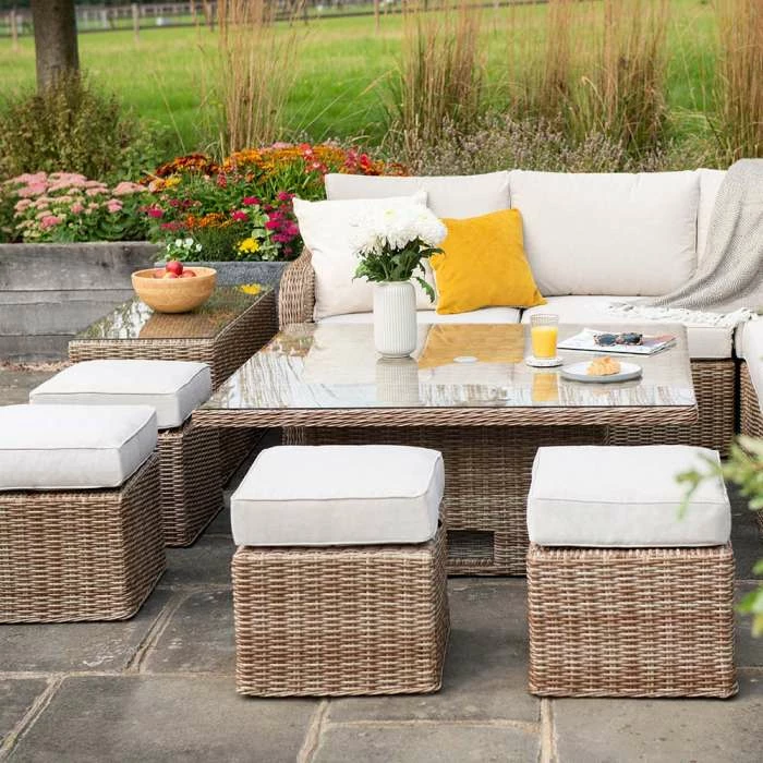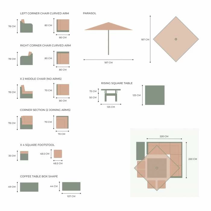 A modular dining set designed for modern outdoor living. The high backed sofa pieces and armchairs are padded with thick, foam-filled cushions that give you unequalled comfort and support.