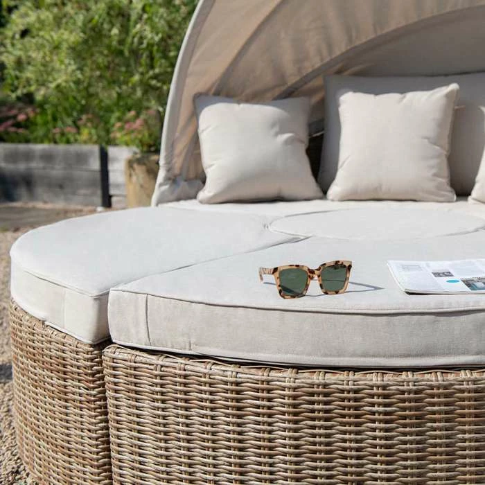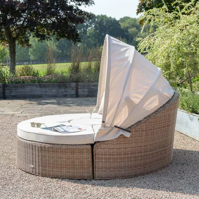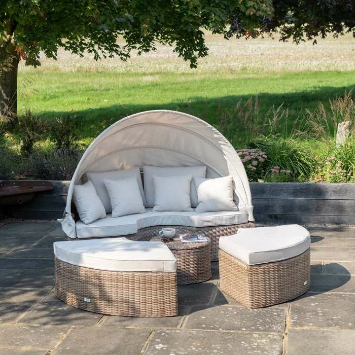 In either layout, the thick, foam-filled cushions give you unrivalled comfort and support. Remove the cushion of the round footstool to turn it into a handy table. The main sofa section comes with a retractable canopy that offers protection in all weathers – giving you the ability to enjoy a multi-use outdoor space year-round.