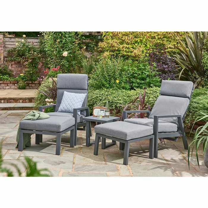 The Relax Lounge Set has 2 generous lounge chairs, 2 stools, and a coffee table. Available in anthracite frames with dark grey cushions. Please note our Handpicked cushions are shower resistant only, they should be stored away dry in bad weather.