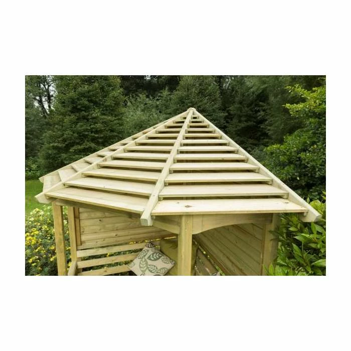 - Corner arbour seat featuring a slatted roof design