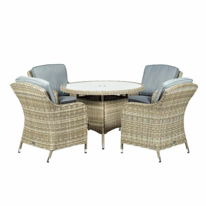 The Wentworth 4 seater imperial dining set is the perfect addition to your outdoor space with its timeless design. Retaining classic style with its aluminium framework construction and hand woven synthetic half round weave rattan it offers style, comfort, strength and durability. Complete with 110cm round tempered glass top table and four imperial chairs including seat cushions, it is perfect for use all year round and will provide years of enjoyment.